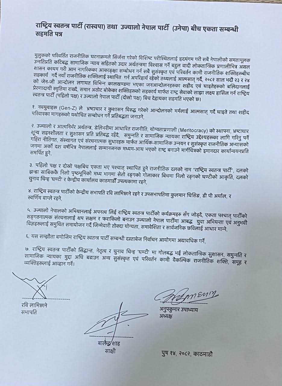 सोमबार काठमाडौंमा आयोजित कार्यक्रममा काठमाडौं महानगरपालिकाका मेयर बालेन्द्र शाहको साक्षीमा रास्वपा सभापति रवि लामिछाने र उज्यालो नेपाल पार्टीका अध्यक्ष अनुपकुमार उपाध्यायले सहमति पत्रमा हस्ताक्षर गरेका हुन्।
