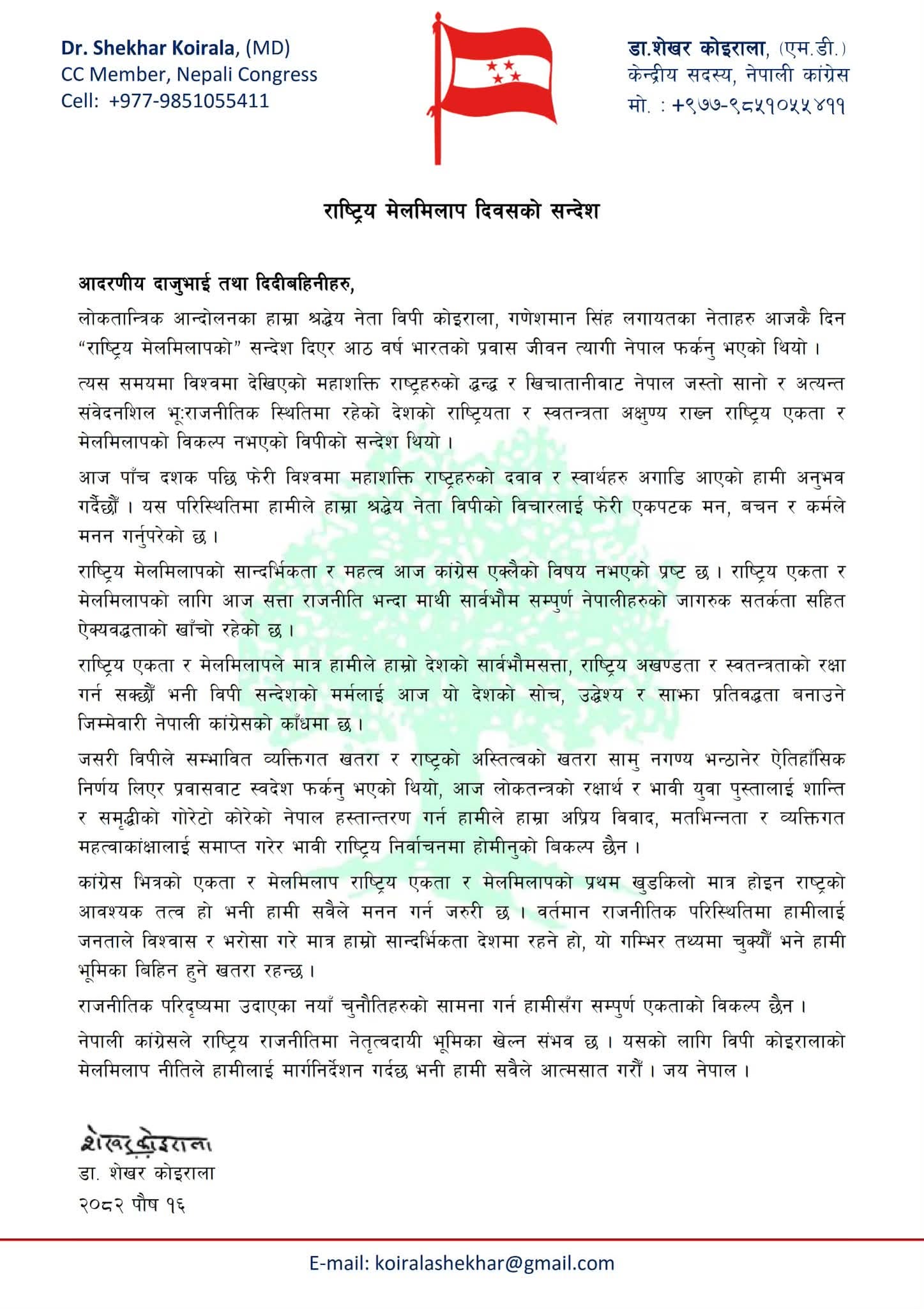 कोइरालाले लोकतान्त्रिक आन्दोलनका अगुवा नेता बिपी कोइराला र गणेशमान सिंहले आजकै दिन राष्ट्रिय मेलमिलापको सन्देश दिँदै आठ वर्षको निर्वासन त्यागेर स्वदेश फर्किएको स्मरण गराएका छन्।