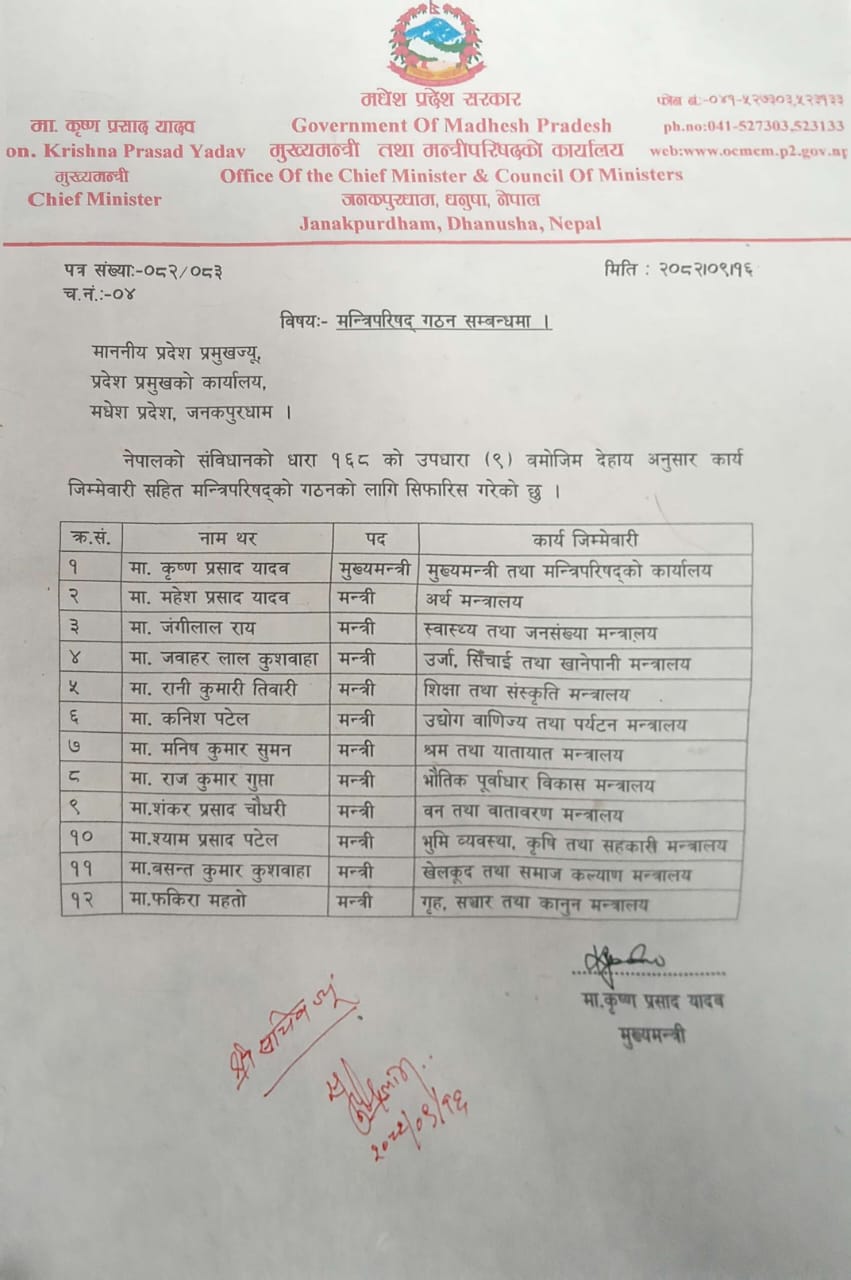मधेस प्रदेशमा मन्त्रिपरिषद् पूर्णता: मुख्यमन्त्री कृष्ण यादवले ६ जना नयाँ मन्त्री थपे
