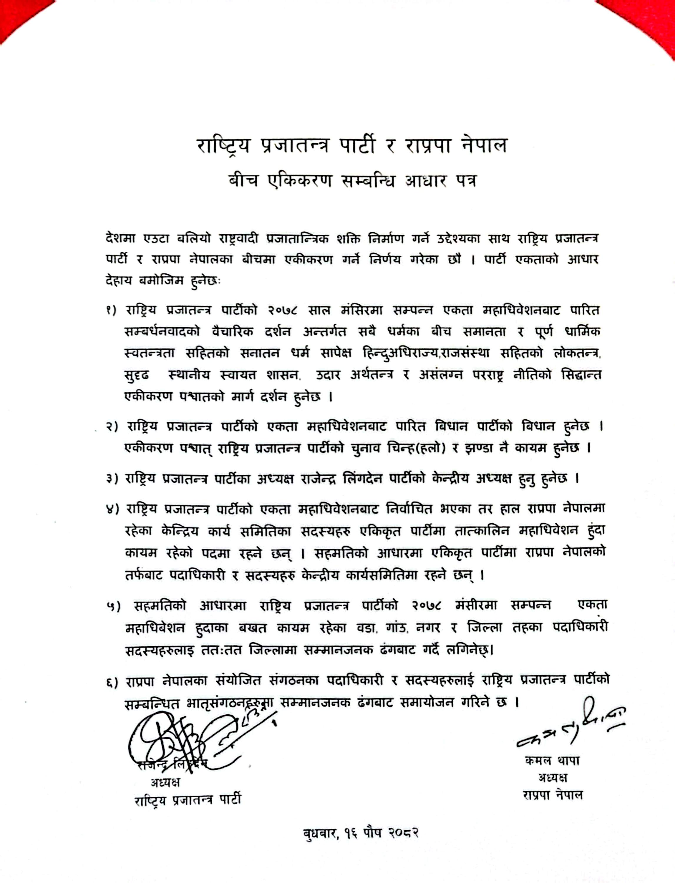 छ बुँदे समझदारी पत्रमा राप्रपाका अध्यक्ष राजेन्द्र लिङ्देन र राप्रपा नेपालका अध्यक्ष कमल थापा ले हस्ताक्षर गरी पार्टी एकता घोषणा गरेका हुन्। एकीकृत पार्टीको नाम “राप्रपा” नै रहनेछ। पार्टीको केन्द्रीय अध्यक्ष राजेन्द्र लिङ्देन रहने सहमति भएको छ भने पार्टीको विधान, झण्डा र चुनाव चिन्ह पुरानो राप्रपाको हलो कायम रहनेछ।