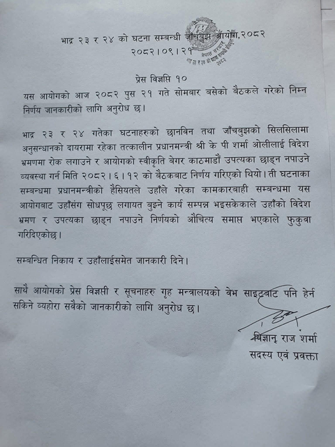 आयोगले तत्कालीन गृहमन्त्री रमेश लेखक र सुरक्षा निकायका प्रमुखहरूसँग पनि बयान लिइसकेको छ। आयोगले अब प्रतिवेदन तयार गर्ने काम अघि बढाउने जनाएको छ।