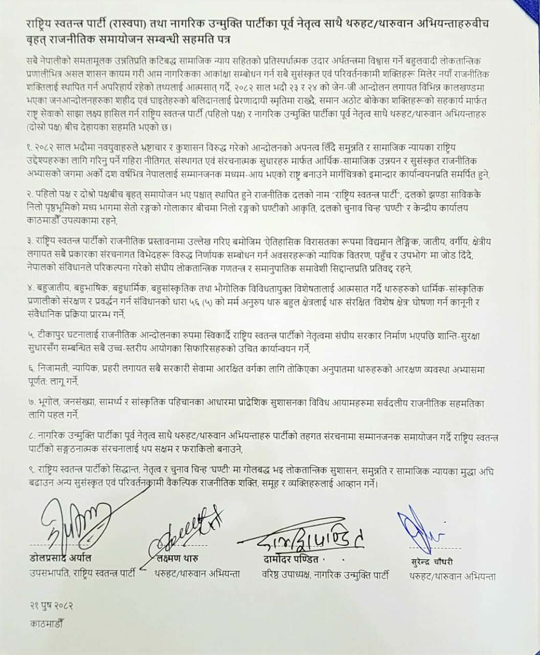 काठमाडौ । राष्ट्रिय स्वतन्त्र पार्टी र नागरिक उन्मुक्ति पार्टीका पूर्व पदाधिकारी तथा थरुहट/थारुवान अभियन्ताबीच सोमबार राष्ट्रिय सभा गृहमा एकता समायोजन कार्यक्रम आयोजना गरी ९ बुँदे सहमति पत्र सार्वजनिक गरिएको छ।