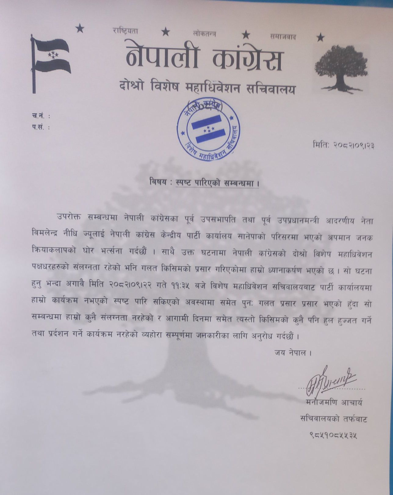काठमाडौ । नेपाली कांग्रेसको विशेष महाधिवेशन पक्षधरहरूले पूर्वउपसभापति विमलेन्द्र निधिमाथि सानेपा स्थित पार्टी कार्यालयमा भएको दुर्व्यवहारप्रति आपत्ति जनाएका छन्।