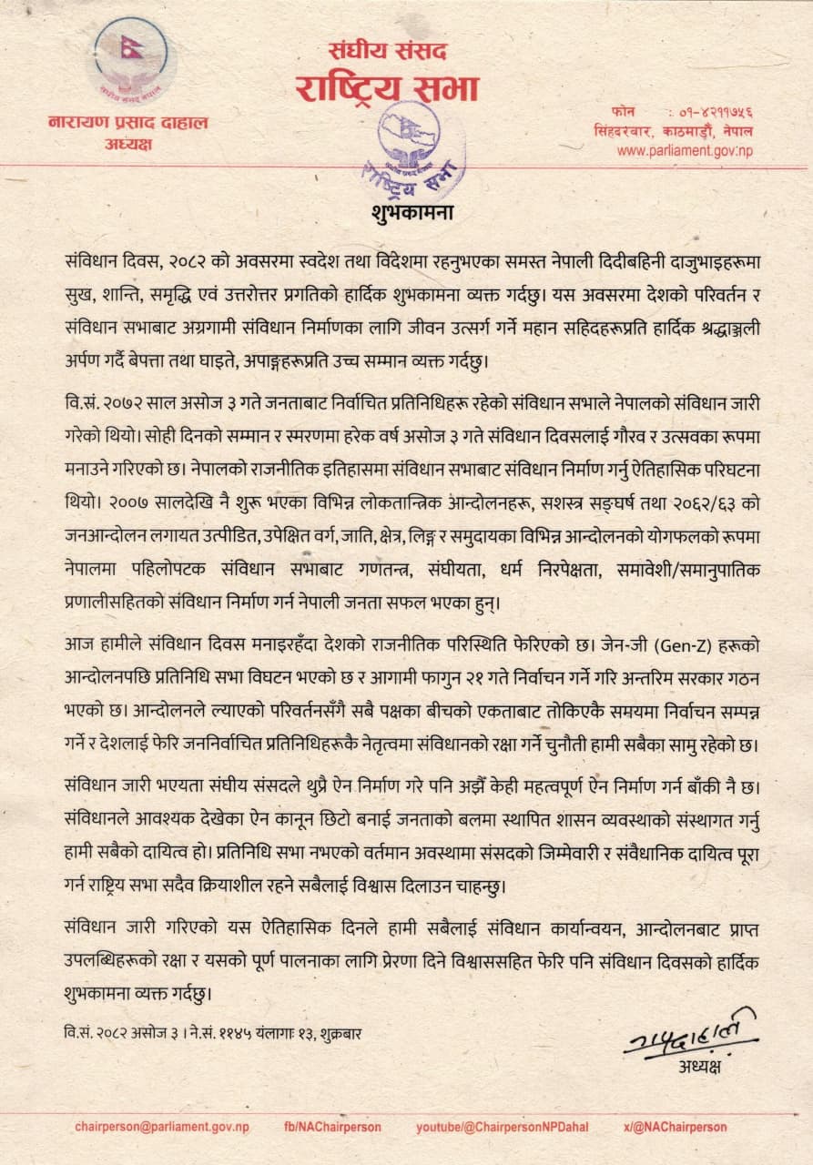 साथै, स्वदेश र विदेशमा रहेका सम्पूर्ण नेपालीलाई सुख, शान्ति र समृद्धिको शुभकामना दिँदै संविधानको कार्यान्वयन र प्राप्त उपलब्धिहरूको संरक्षणमा सक्रिय रहन सबैलाई आह्वान गरेका छन् ।