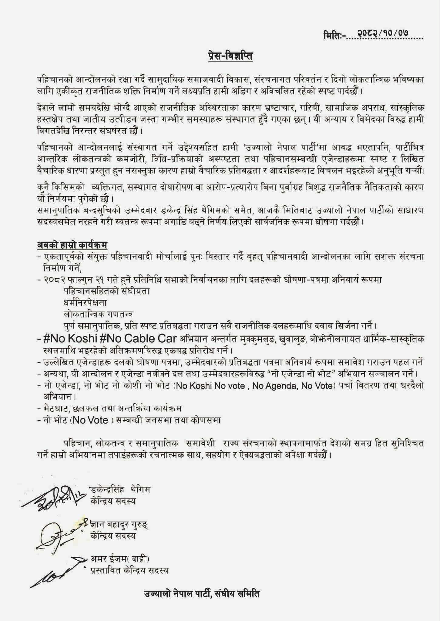विज्ञप्तिमा भनिएको छ कि पार्टी छाडेपछि उनीहरूले स्वतन्त्र भएर संयुक्त पहिचानवादी मोर्चालाई सशक्त बनाउने योजना बनाएका छन्। उज्यालो नेपाल पार्टीभित्र डकेन्द्रसिंह थेगिम आदिबासी–जनजाति क्लष्टरको तेस्रो नम्बरको समानुपातिक उम्मेदवारमा समावेश थिए। पार्टी गठनपछि रास्वपासँगको एकताको पछि केही नेताहरू रास्वपामा रहँदा पहिलो झटका भोगेका थिए।