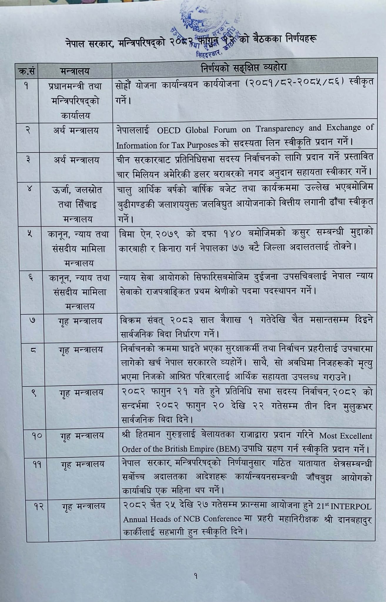 काठमाडौ । सरकारले हिजो बसेको मन्त्रिपरिषद् बैठकको निर्णय सार्वजनिक गरेको छ ।