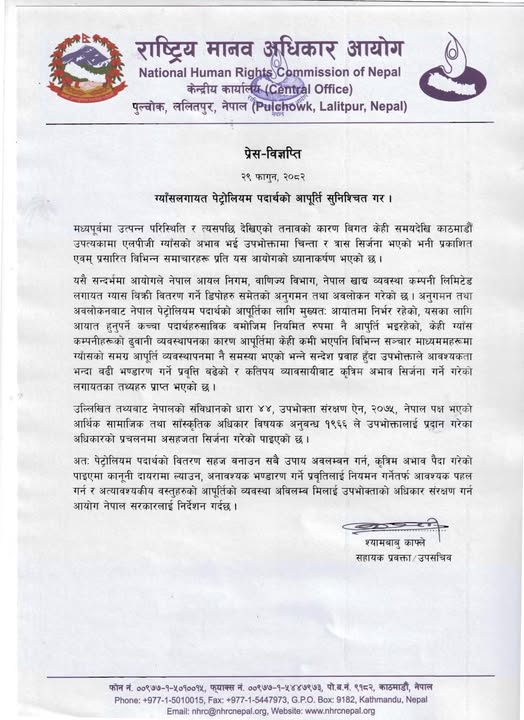 काठमाडौ । राष्ट्रिय मानव अधिकार आयोगले ग्याँस र अन्य पेट्रोलियम पदार्थको पर्याप्त आपूर्ति सुनिश्चित गर्न सरकारले तत्काल कदम चाल्न निर्देशन दिएको छ। आयोगले जारी गरेको प्रेस विज्ञप्तिमा यस सम्बन्धमा जानकारी दिइएको हो।