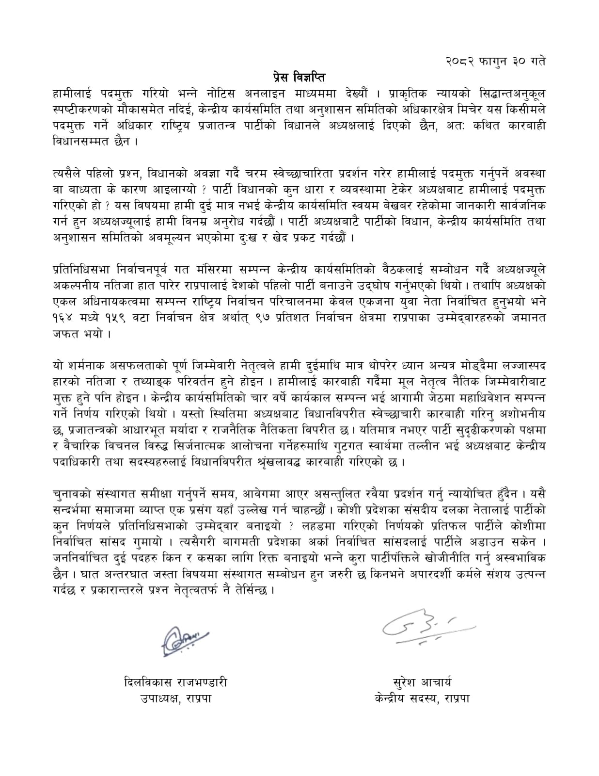 राप्रपाका उपाध्यक्ष दिलविकास राजभण्डारी र केन्द्रीय सदस्य सुरेश आचार्यले शनिबार विज्ञप्ति जारी गर्दै स्पष्टीकरणको मौका समेत नदिई केन्द्रीय कार्यसमिति र अनुशासन समितिको अधिकार क्षेत्र मिचेर आफूहरूलाई पदबाट हटाइएको बताएका हुन्।