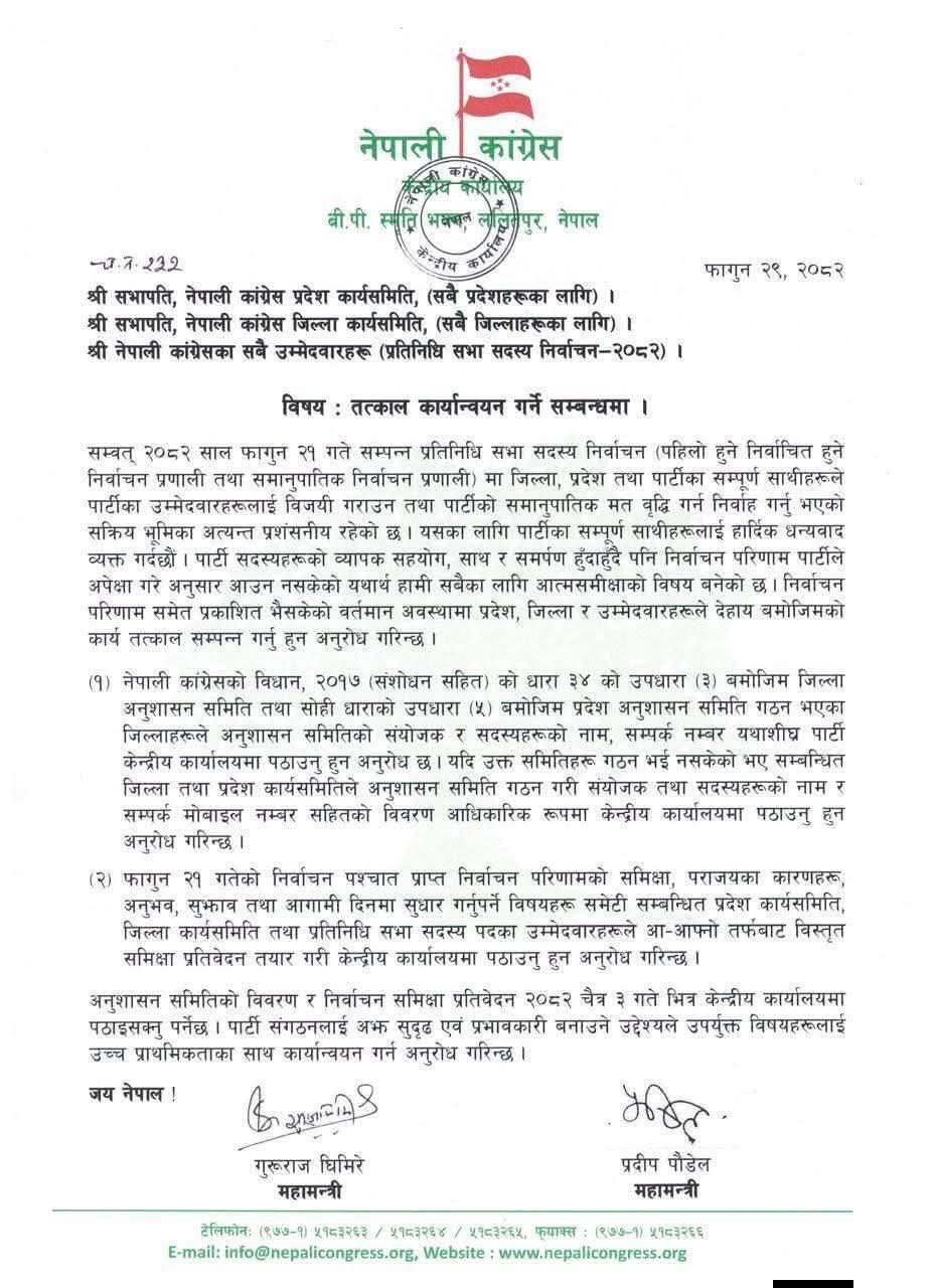 पार्टी केन्द्रीय कार्यालयले सबै प्रदेश, जिल्ला कार्यसमिति र उम्मेदवारहरूलाई तत्काल अनुशासन समिति गठन गरी हारको कारण पहिचान गर्न निर्देशन दिएको हो। परिपत्र महामन्त्रीद्वय गुरुराज घिमिरे र प्रदीप पौडेल द्वारा हस्ताक्षरित छ।