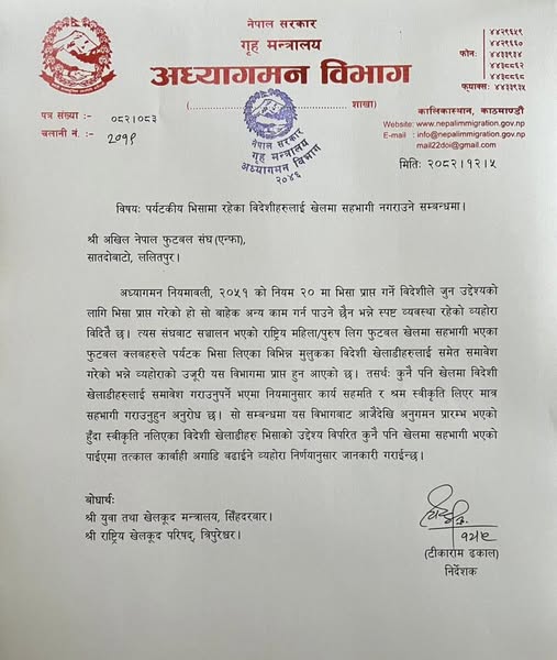 पर्यटकीय भिसामा रहेका विदेशी खेलाडीलाई फुटबल प्रतियोगितामा सहभागी नगराउन अध्यागमन विभागको निर्देशन