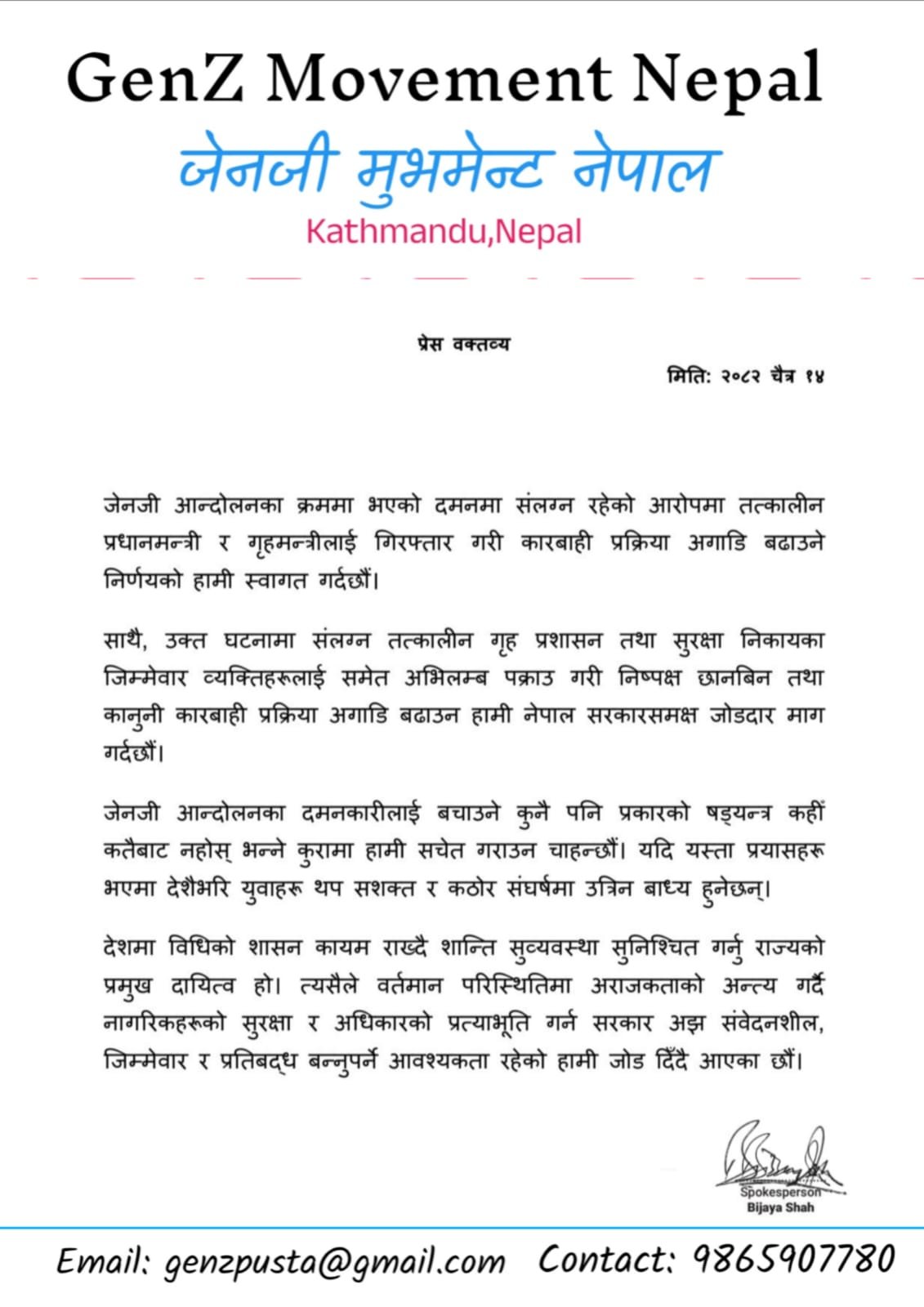 विशेषगरी तत्कालीन गृह प्रशासन र सुरक्षा निकायका जिम्मेवार व्यक्तिहरूलाई पनि अनुसन्धानमा ल्याउनुपर्ने उनीहरूको भनाइ छ। जेनजी मुभमेन्टले दमनकारीलाई बचाउने प्रयास भए कडा आन्दोलन गर्ने चेतावनी दिएको छ। आवश्यक परे देशभरका युवाहरू अझ कडा संघर्षमा उत्रिने बताएका छन्।