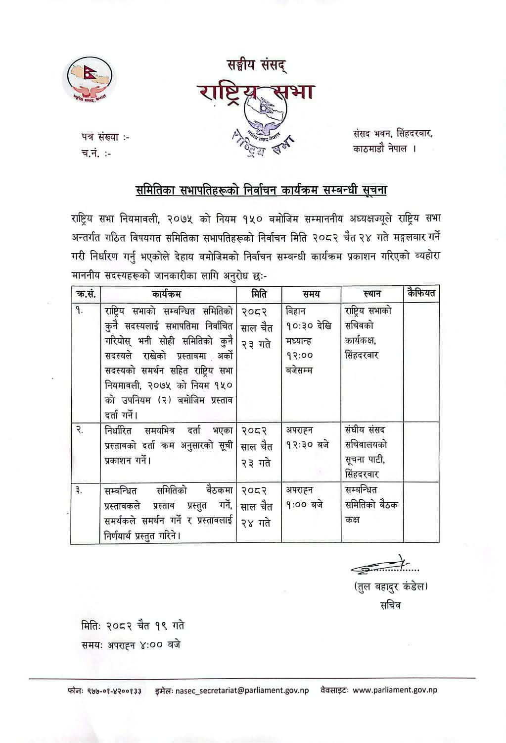 त्यस्तै, राष्ट्रिय सभाका विषयगत समितिका रिक्त सभापतिहरूको निर्वाचन चैत २४ गते हुने जनाइएको छ। यसका लागि राष्ट्रिय सभा सचिव तुलबहादुर पाण्डेलाई पनि आवश्यक सूचना प्रकाशित गर्न भनिएको छ। राष्ट्रिय सभाको अर्को बैठक भने चैत २२ गते बस्नेछ।