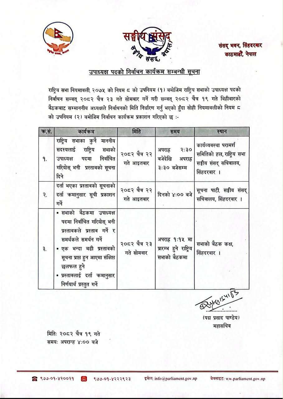 काठमाडौ । राष्ट्रिय सभा उपाध्यक्ष पदको निर्वाचन चैत २३ गते हुने तय गरिएको छ।