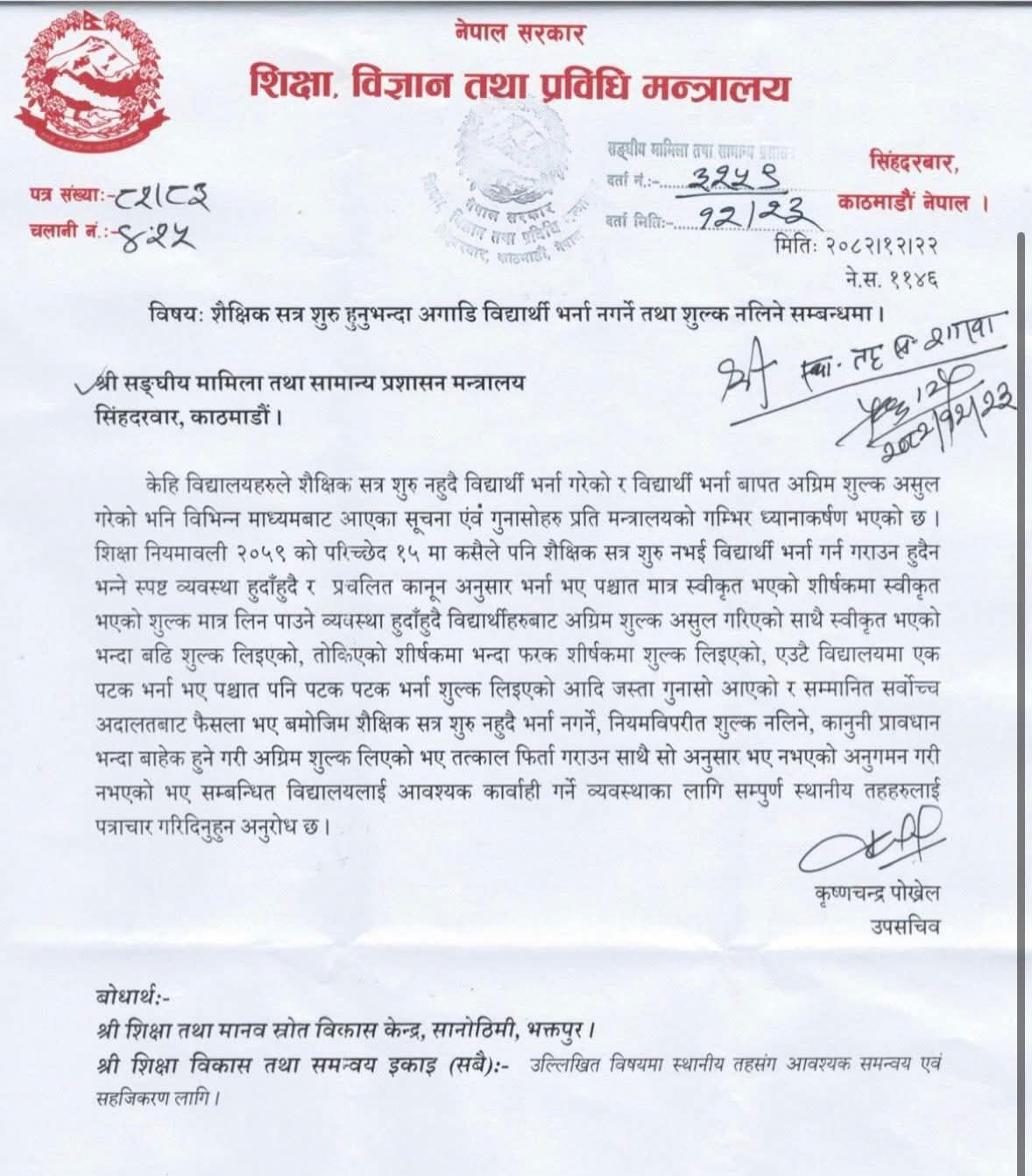 मन्त्रालयको पत्रमा भनिएको छ कि शैक्षिक सत्र सुरु नहुँदै भर्ना गर्नु, स्वीकृत शीर्षकभन्दा बाहिर शुल्क उठाउनु र एउटै विद्यार्थीलाई पटक–पटक शुल्क लिनु गैरकानुनी हो। साथै, नियमविपरीत लिएको अग्रिम शुल्क तत्काल फिर्ता गराउन र अटेरी गर्ने विद्यालयलाई कठोर कारबाही गर्न मन्त्रालयले भनेको छ।