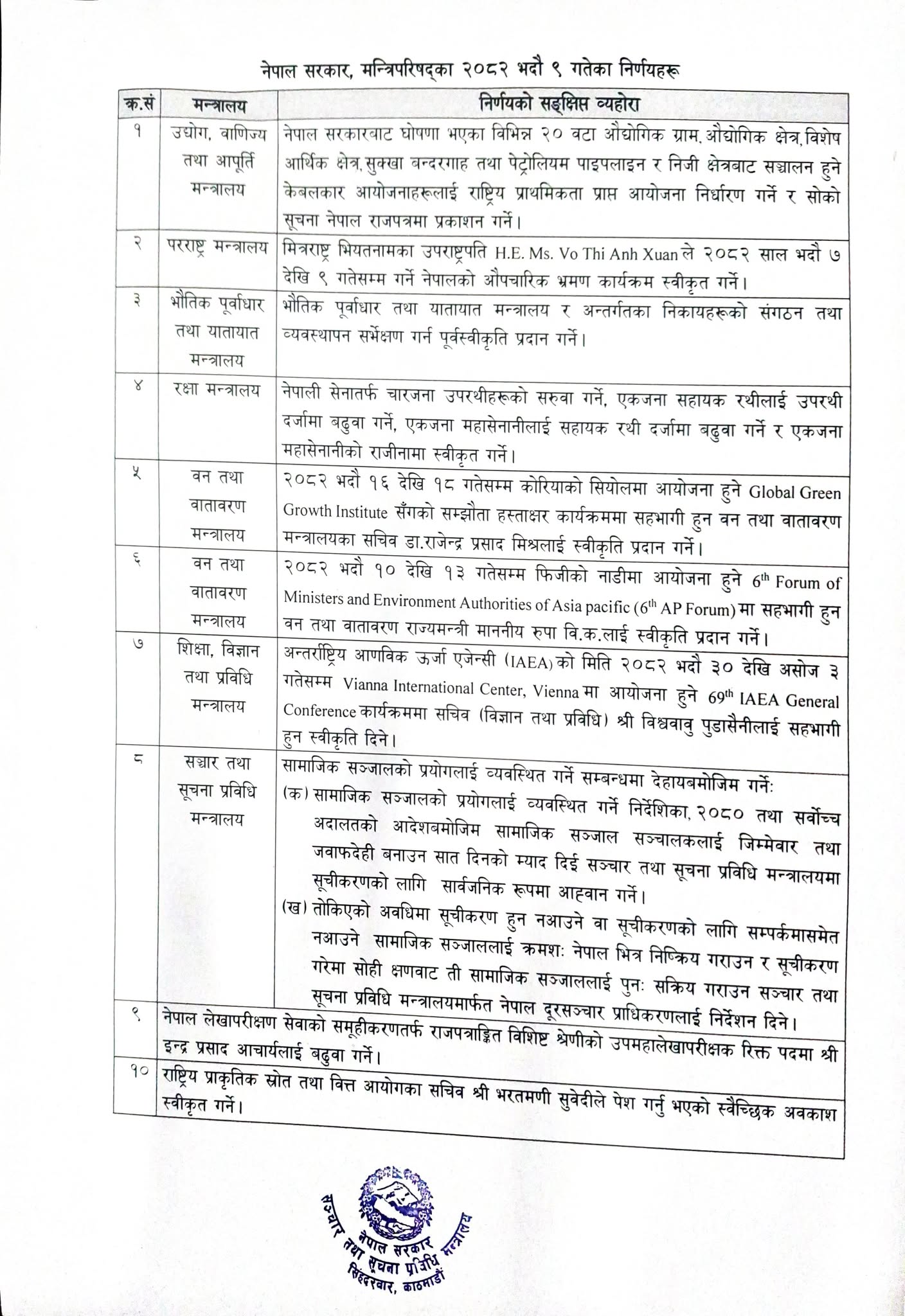 काठमाडौं । गत सोमबार बसेको मन्त्रिपरिषद् बैठकका निर्णयहरू सार्वजनिक गरिएको छ । बुधबार सरकारका प्रवक्ता समेत रहेका सञ्चार तथा सुचना प्रविधिमन्त्री पृथ्वीसुब्बा गुरुङले मन्त्रिपरिषद् बैठकका विभिन्न १० वटा निर्णयहरू सार्वजनिक गरेका हुन् ।