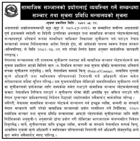 सरकारको यस कदमले सामाजिक सञ्जालहरूको प्रयोगलाई पारदर्शी, उत्तरदायी र नियमनयोग्य बनाउने अपेक्षा गरिएको छ।