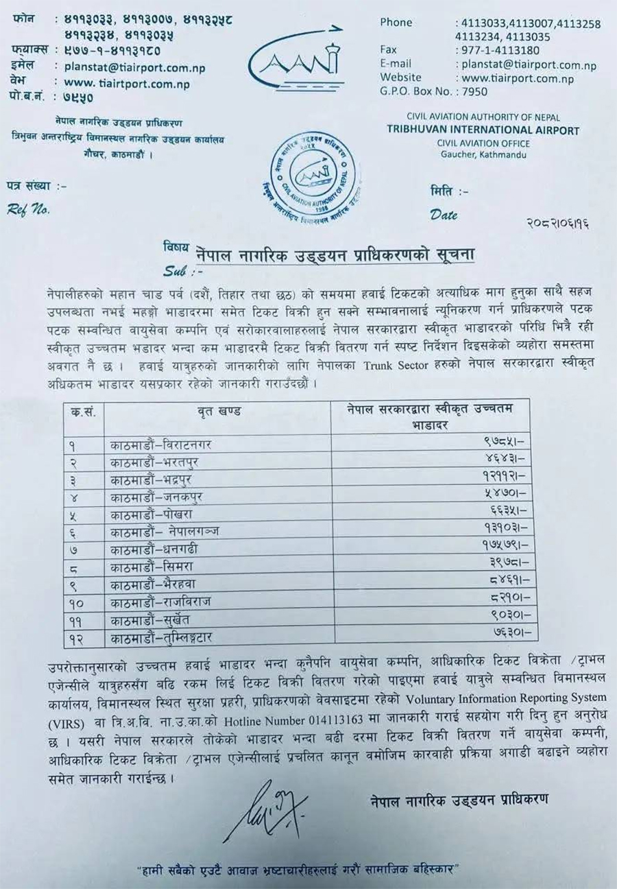 काठमाडौ । नेपाल नागरिक उड्डयन प्राधिकरणले चाडपर्व तथा विशेष अवसरका बेला आन्तरिक उडानमा टिकटको अधिक मागलाई मध्यनजर गर्दै नयाँ हवाई भाडादर सार्वजनिक गरेको छ।