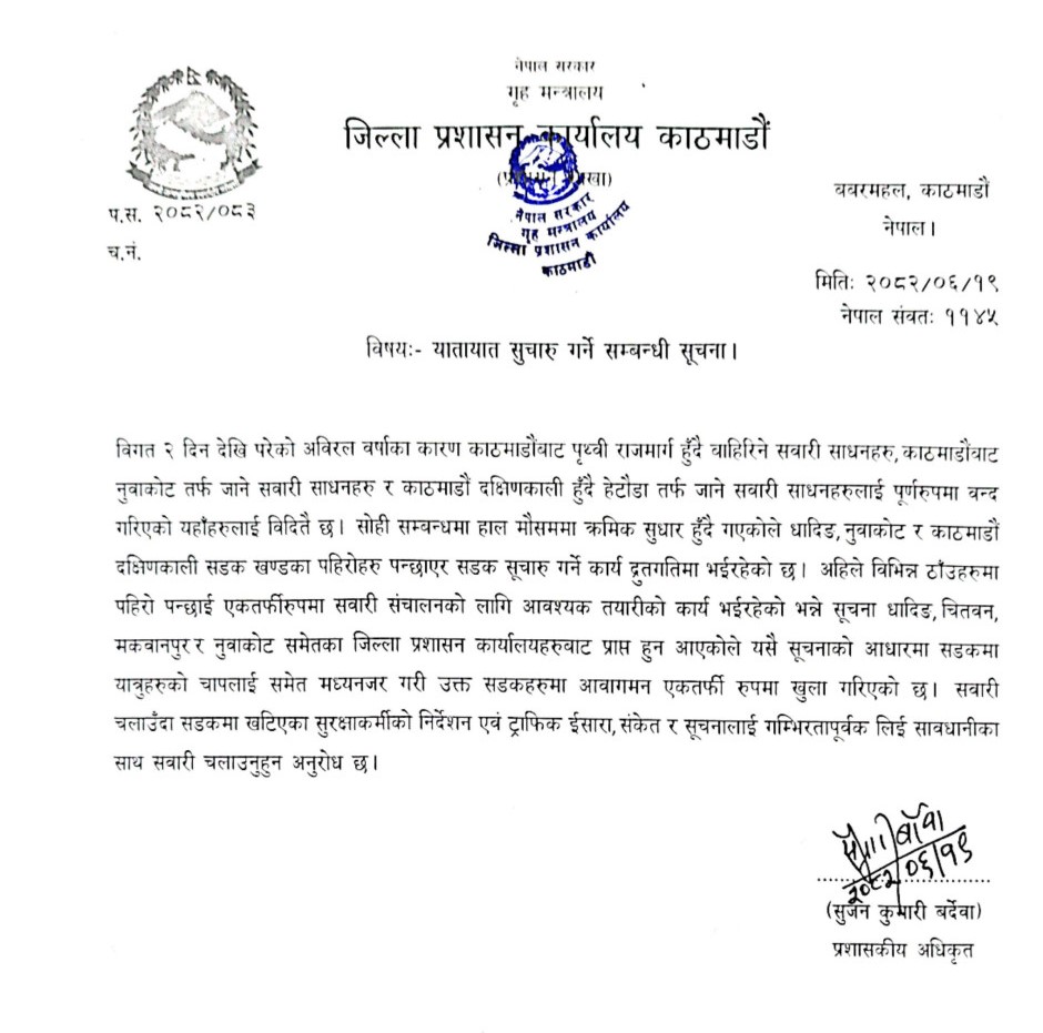 काठमाडौ । काठमाडौं जिल्ला प्रशासन कार्यालयले अविरल वर्षाका कारण अवरुद्ध भएका सडकहरू एकतर्फी रुपमा खुला गर्ने निर्णय गरेको छ। पहिरो पन्छाएर सडक सञ्चालनको तयारी भइरहेकाले धादिङ, चितवन, मकवानपुर र नुवाकोट प्रशासनको सूचनाका आधारमा उक्त जिल्लातर्फ जाने आवागमनलाई एकतर्फी रुपमा सञ्चालन गरिने भएको हो।