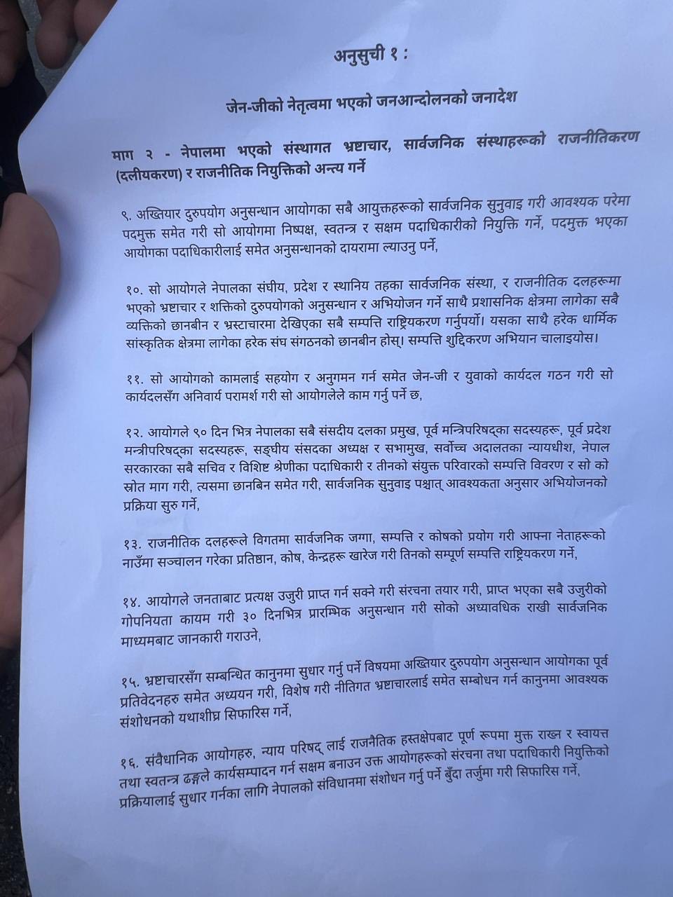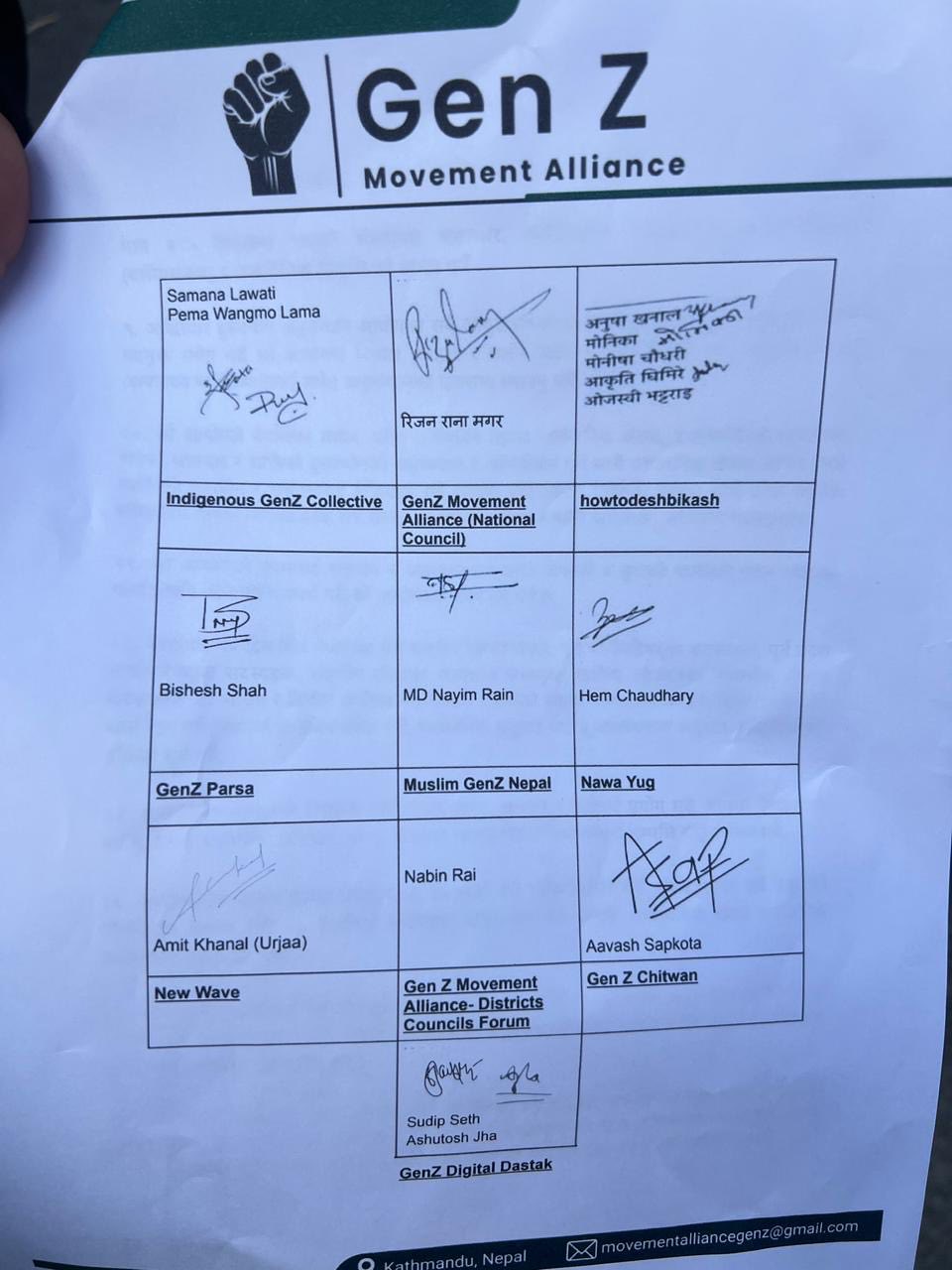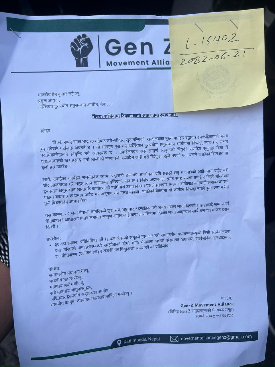 जेनजी मुभमेन्ट अलायन्सले राजीनामा मागिएको निवेदन