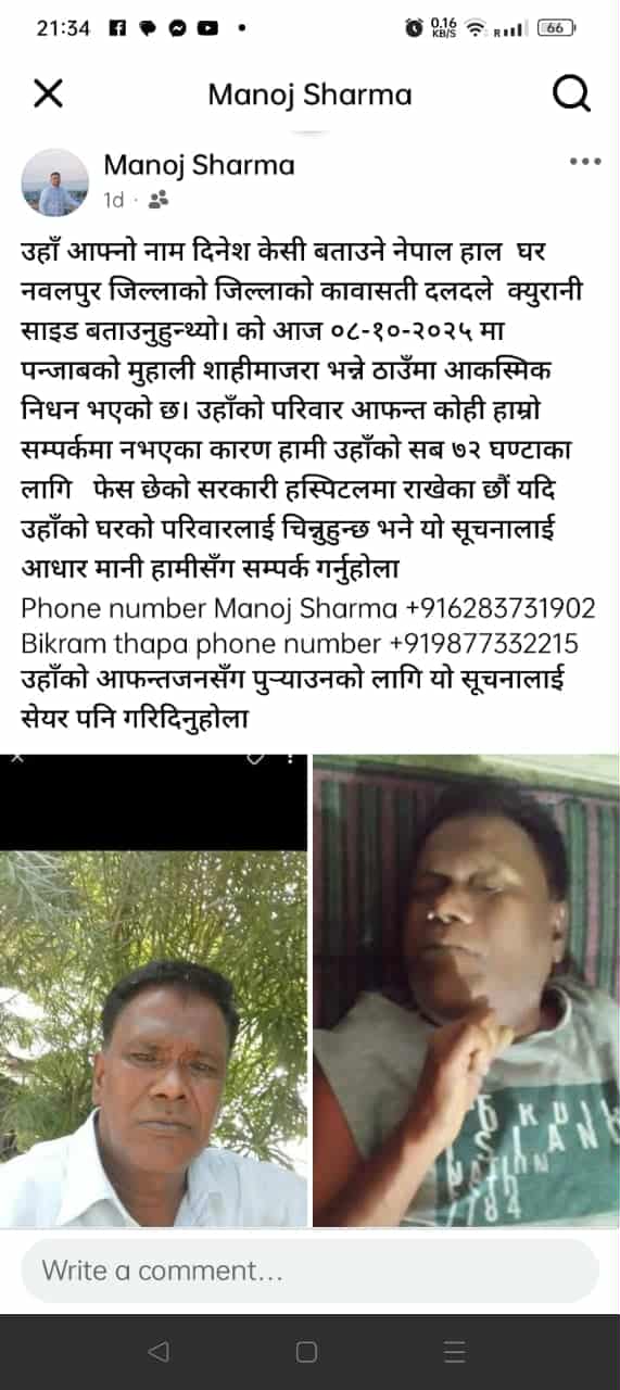 नाम दिनेश केसी बताउने उनले आफ्नो घर नवलपुरको कावासोती दलदले क्युरेनी भएको चण्डिगढमा रहेको नेपालीहरुलाई बताएका थिए । पञ्जाबको मुहाली शाहीमाजरा भन्ने स्थानमा केसीको आकस्मिक निधन भएको हो ।